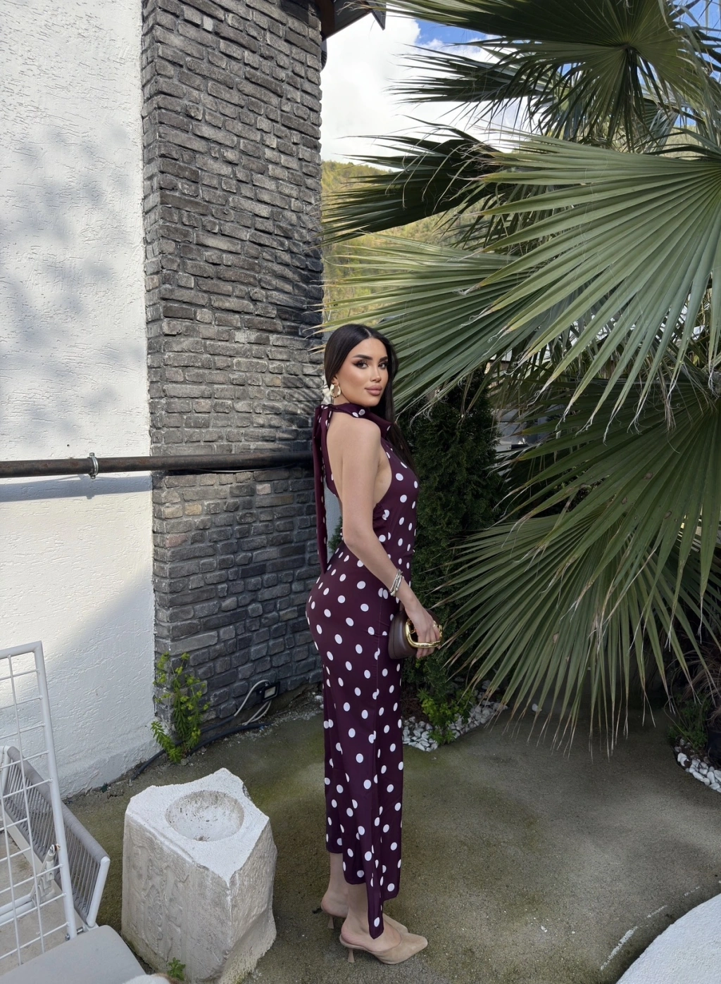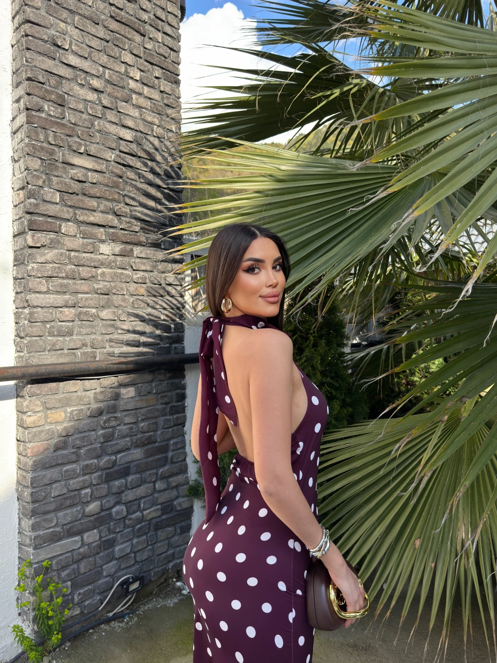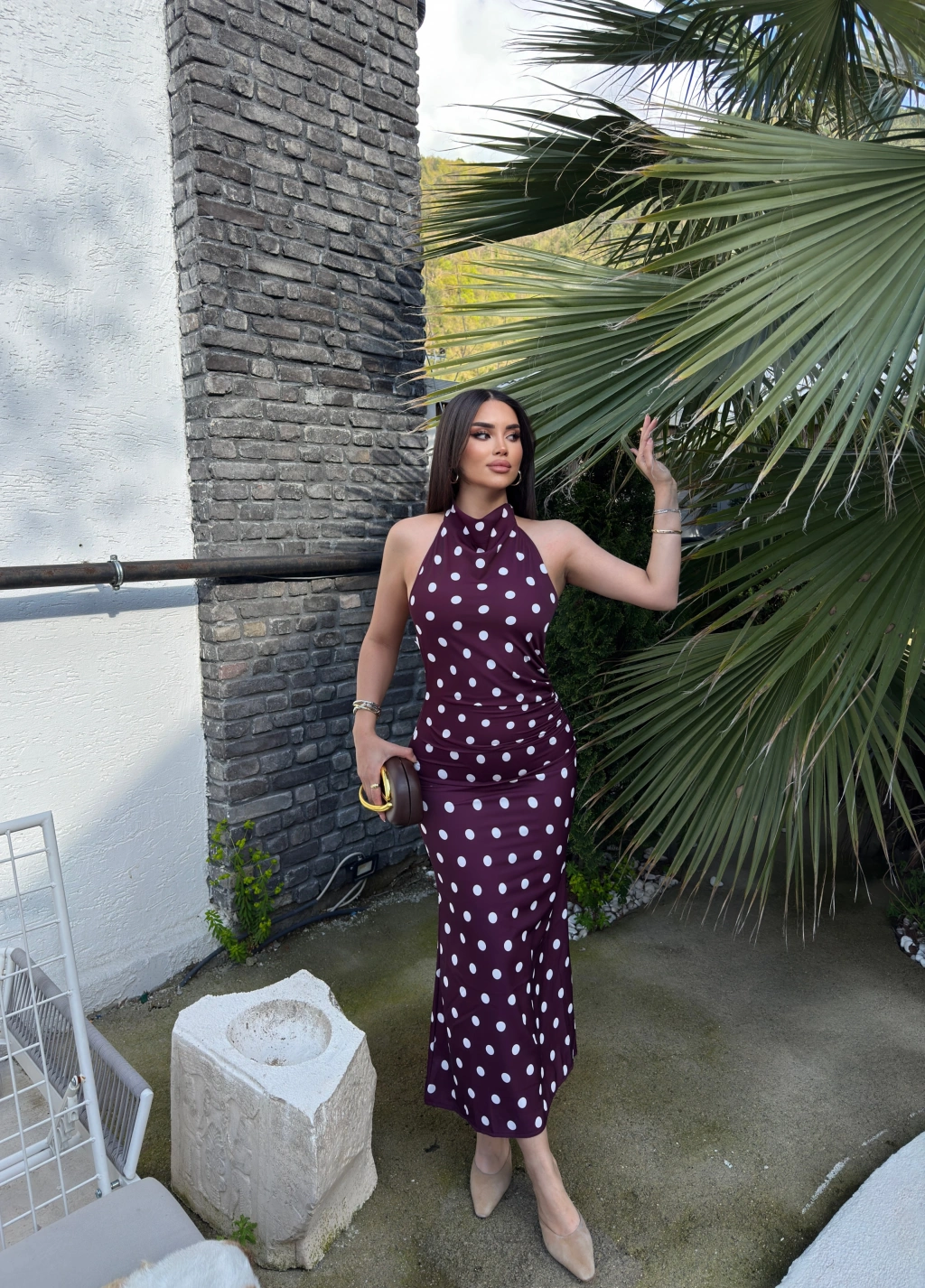 Bordo Puantiyeli Premium Uzun Elbise