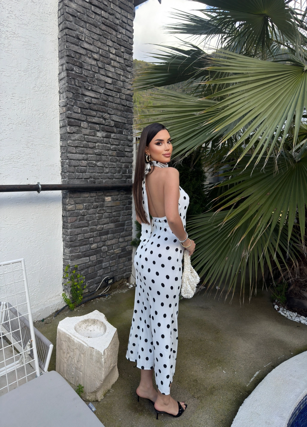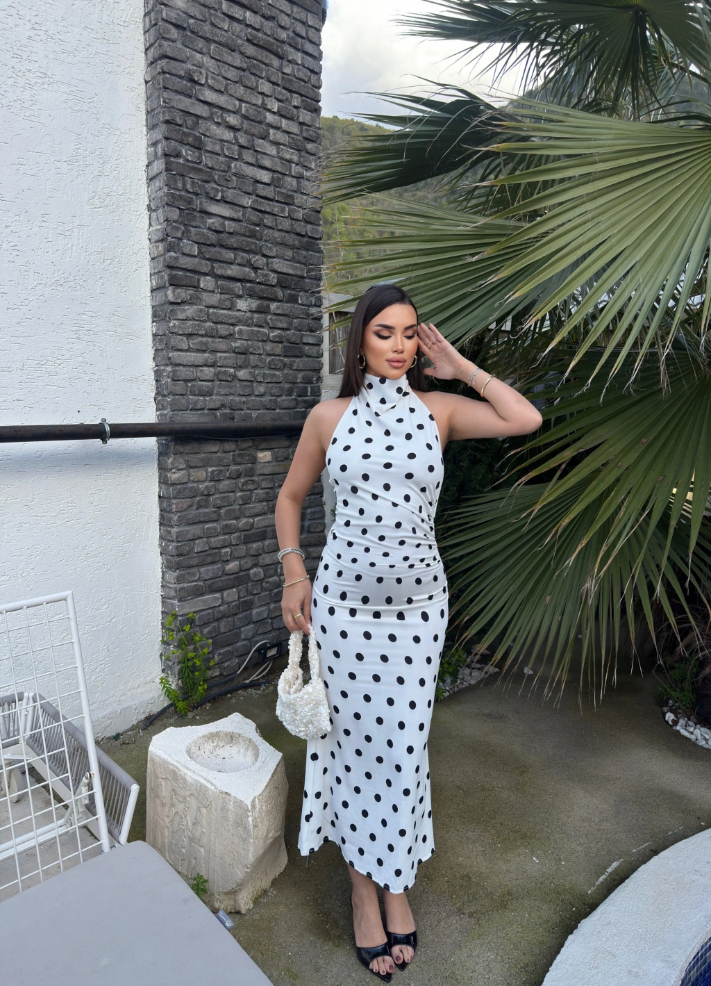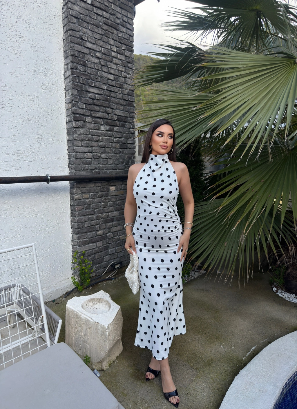 Beyaz Puantiyeli Premium Uzun Elbise