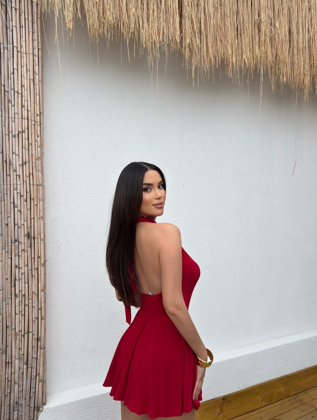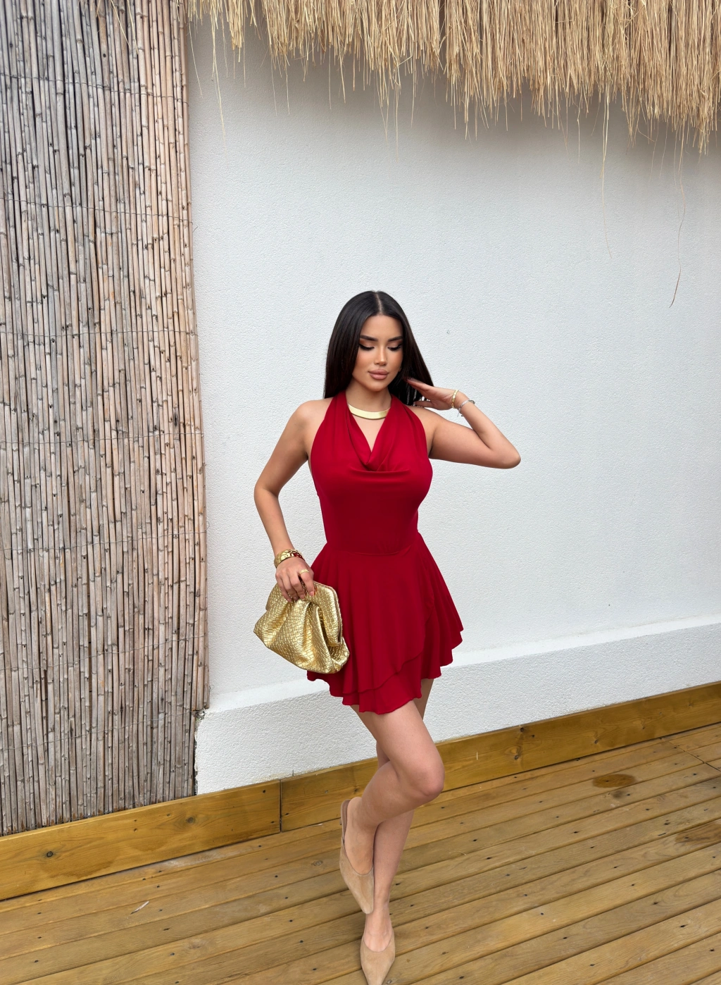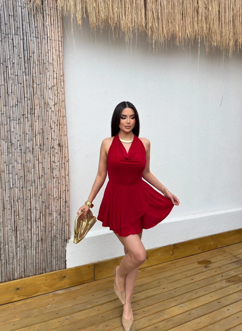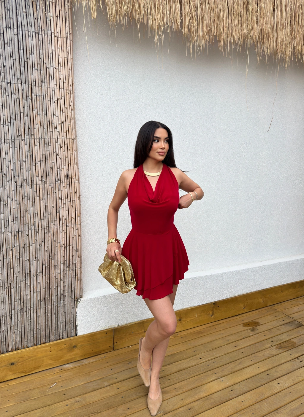 Kırmızı Degaje Yaka Boyundan Bağlamalı Mini Elbise