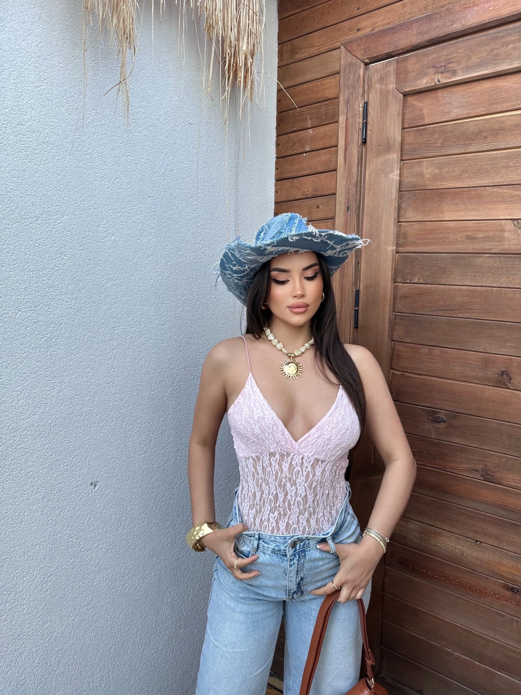 Pembe İp Askılı Dantel Bodysuit