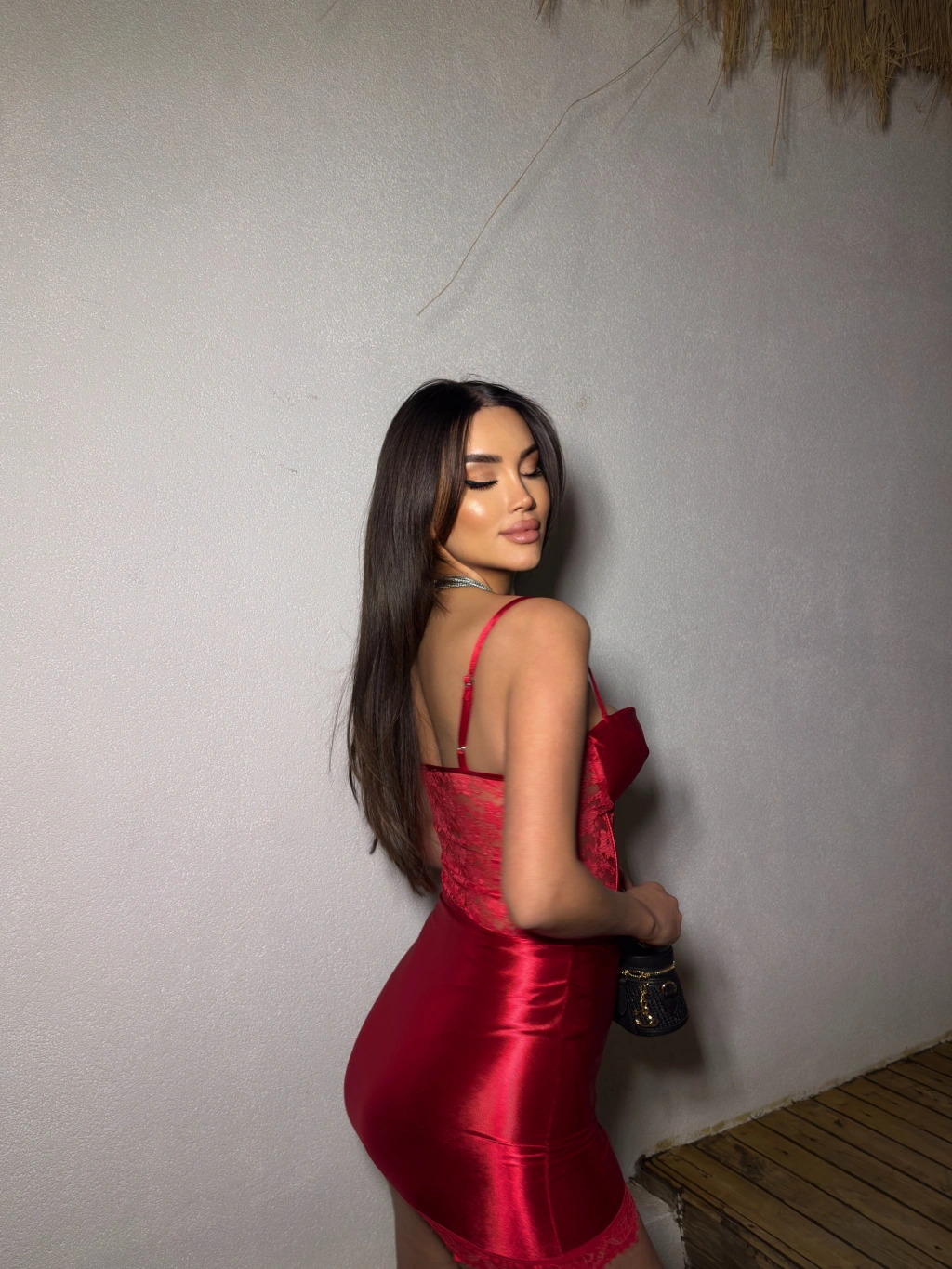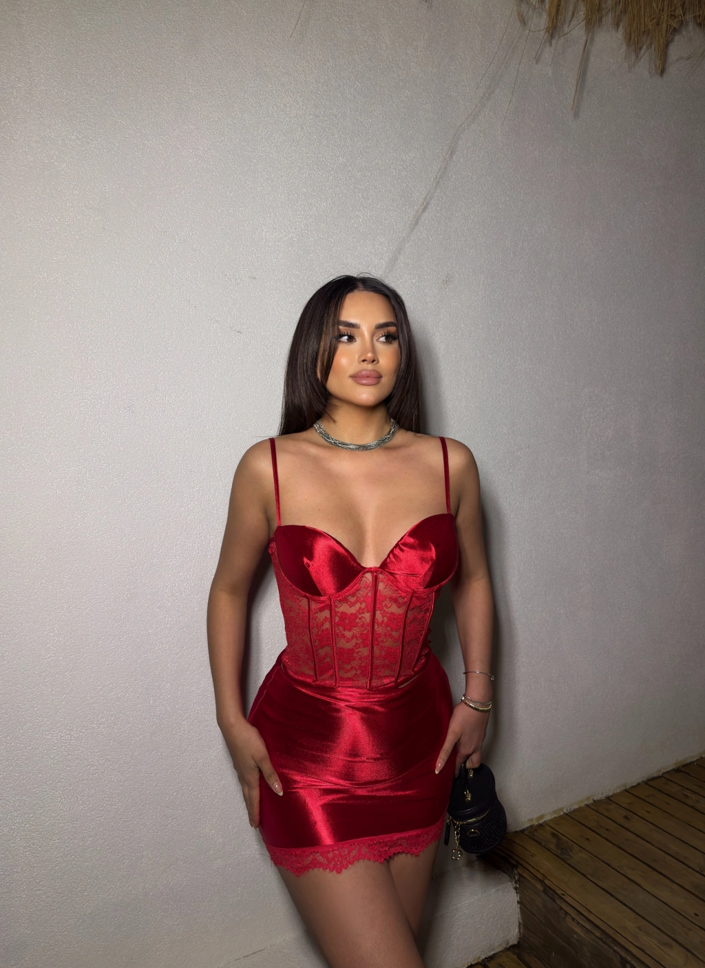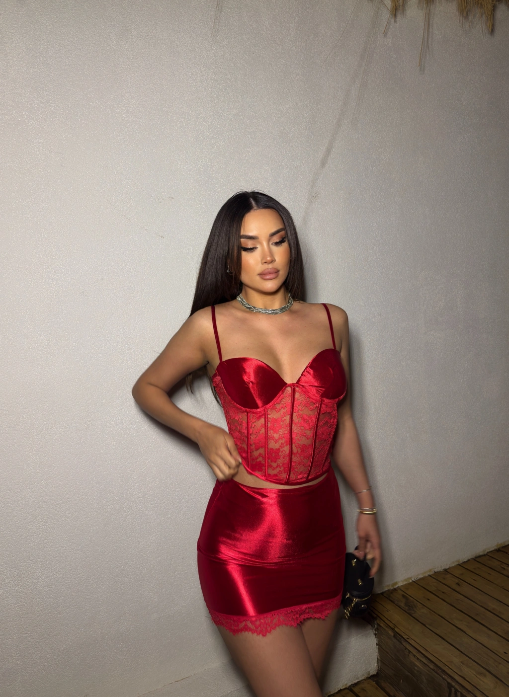 Kırmızı Saten Dantel Detay Etek Takım