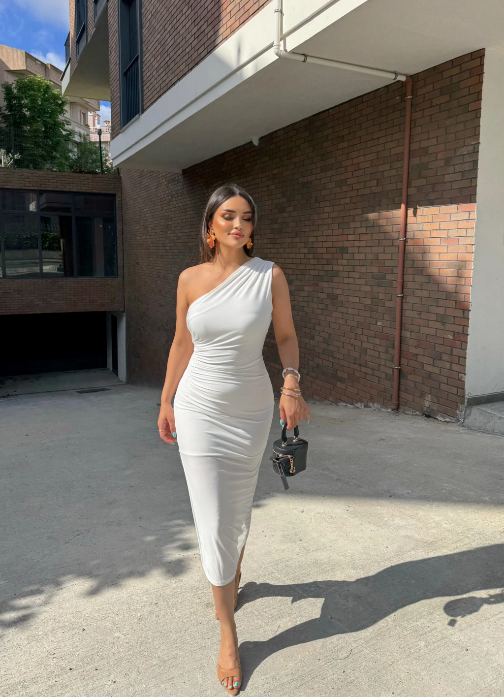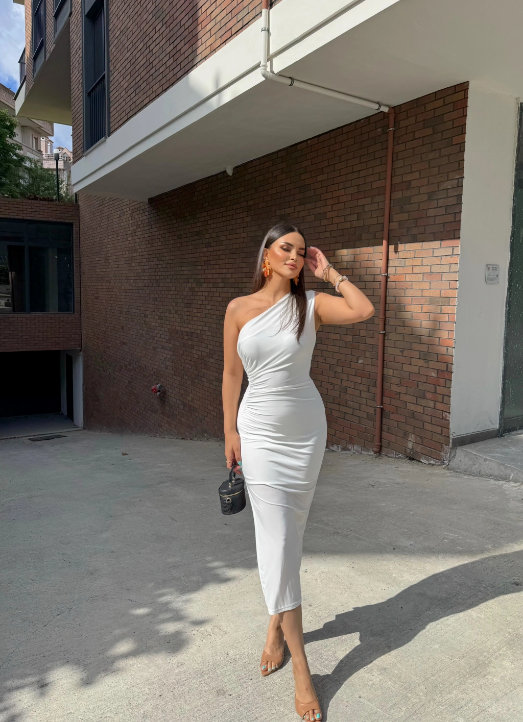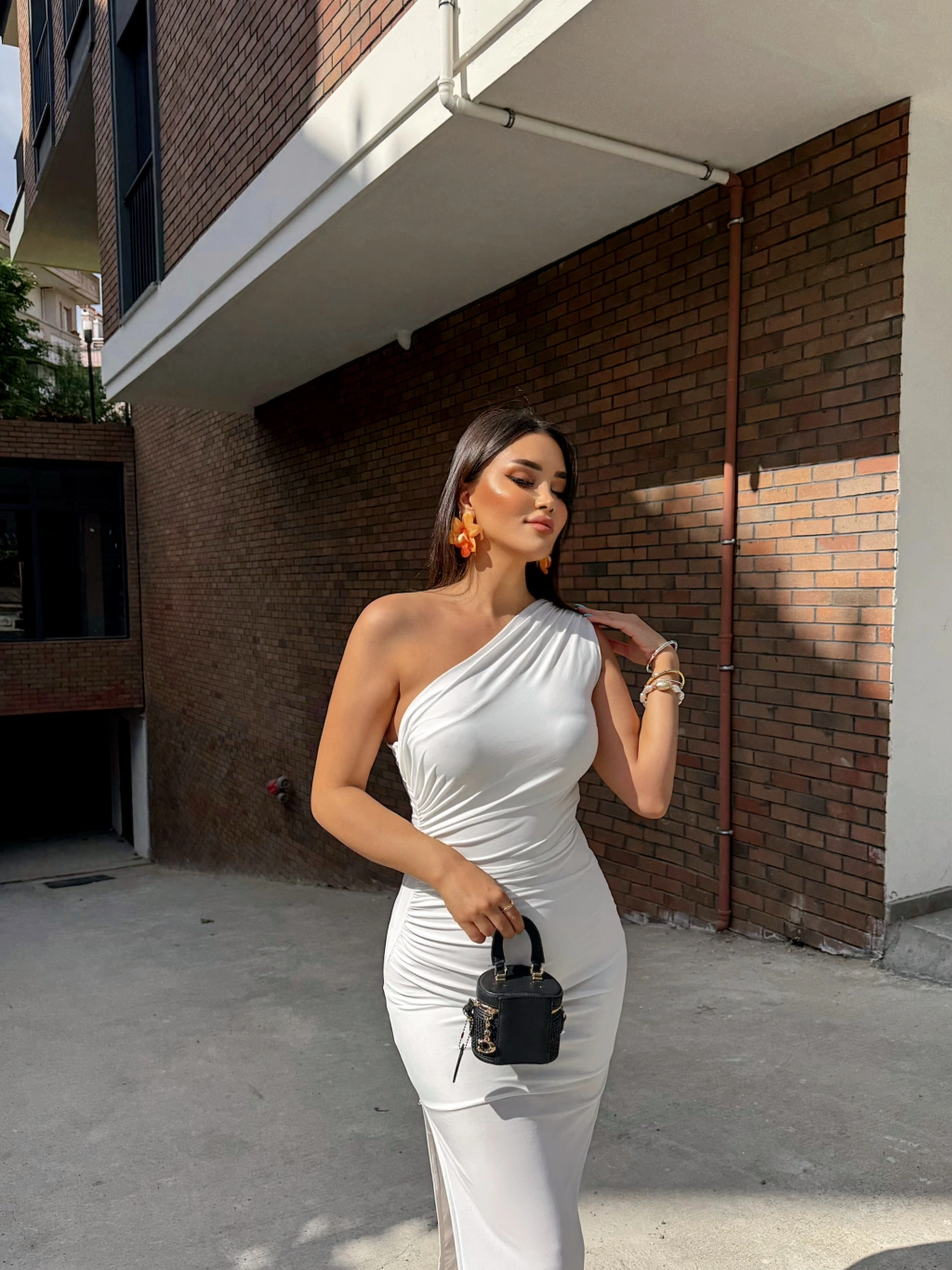 Beyaz Tek Omuz Astarlı Premium Elbise