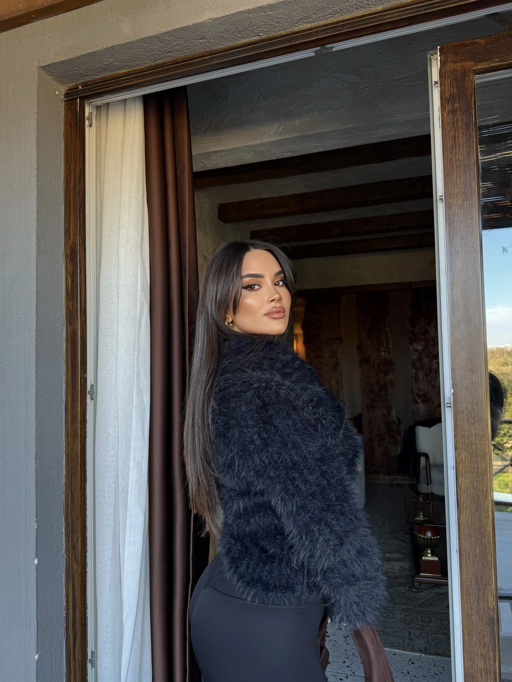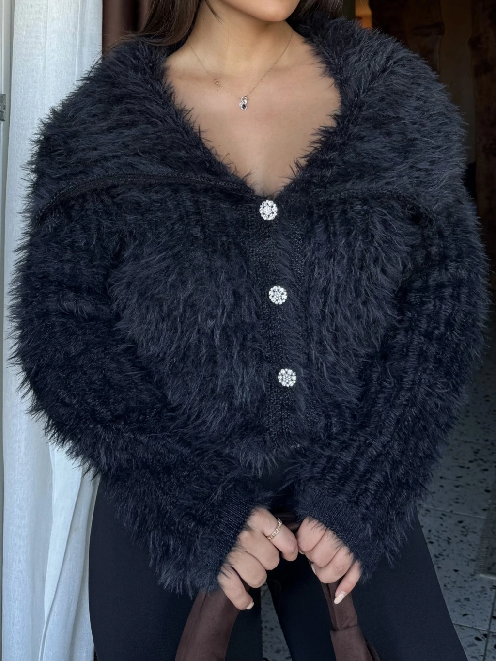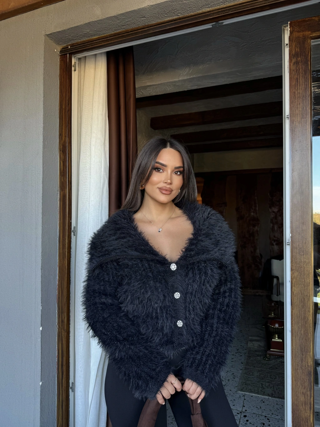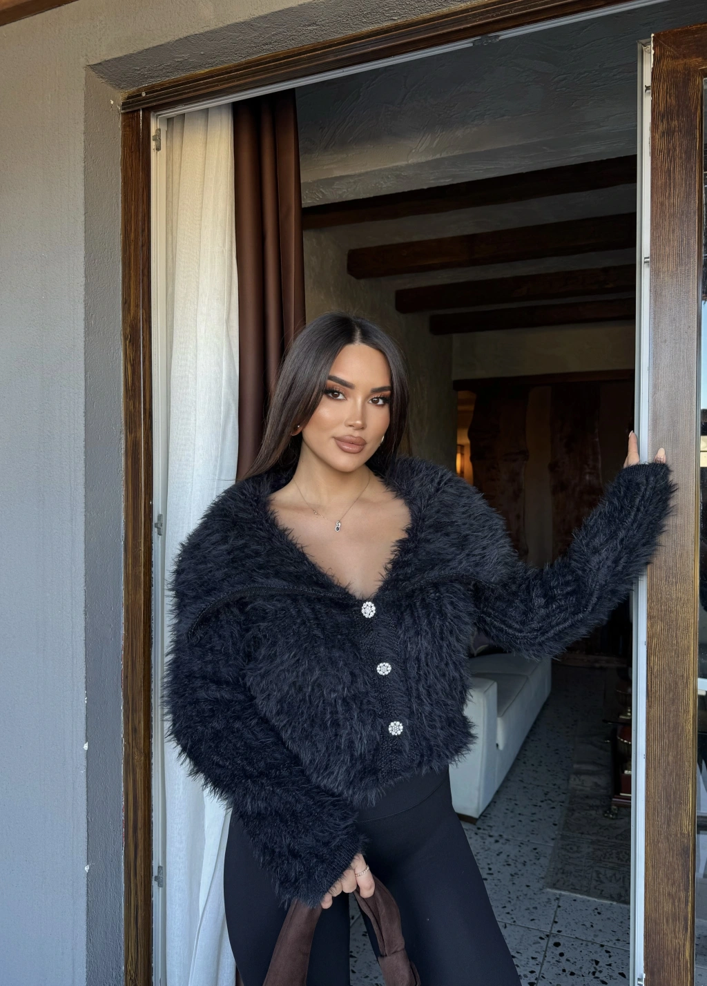 Siyah Polo Yaka Taşlı Yumoş Kazak