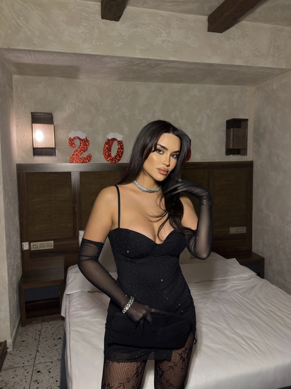 Siyah Taş Detaylı Gloplu Eldivenli Elbise